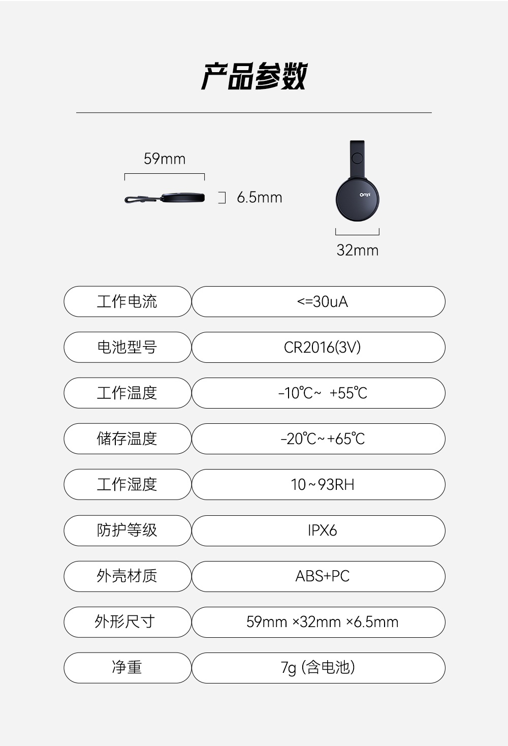 | 外形尺寸 | 長(zhǎng)寬高:59mm ×32mm ×6.5mm(含硅膠帶) |